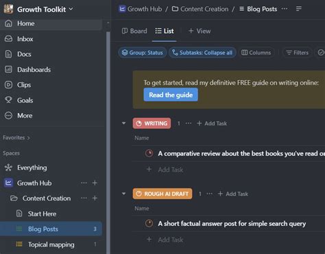 ClickUp offers various views (List, Board, Calendar, Gantt, Table, etc.). Experiment with these to find the best way to visualize your project. A Kanban board is great for workflow, while a Gantt chart is ideal for timeline planning. Don’t forget Automations ! Set up rules to streamline repetitive actions. For instance: