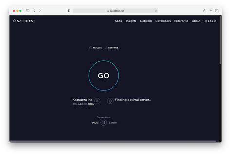 3. Start the test: Click the “Go” button (on the web) or tap the “Begin Test” button (on the app) to start the test. Speedtest will first measure your download speed, then your upload speed, and finally your ping (latency).