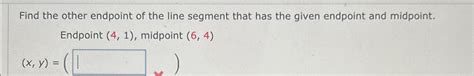 Before we jump into the how-to, let’s make sure we’re all on the same page about what endpoints and midpoints are. In geometry, a line segment is a part of a line that is bounded by two distinct endpoints, and contains every point on the line between its endpoints. An endpoint is simply a point at which a line segment or a curve ends. Think of it as the ‘start’ and ‘finish’ points of a line. The midpoint , on the other hand, is the point exactly halfway between the two endpoints. It’s the point that divides the line segment into two equal parts. Understanding these basic concepts is crucial because the midpoint formula relies on these definitions to help you determine the coordinates of the unknown endpoint. Now, when you’re given one endpoint and the midpoint, your mission is to find the coordinates of the other endpoint. This involves a bit of algebraic manipulation, but don’t worry; we’ll walk through it together. Remembering that the midpoint is equidistant from both endpoints will help you visualize the problem and apply the midpoint formula correctly. Moreover, knowing these definitions will enable you to check whether your final answer makes sense in the context of the problem. So, let’s keep these concepts in mind as we move forward and learn how to find the missing endpoint!