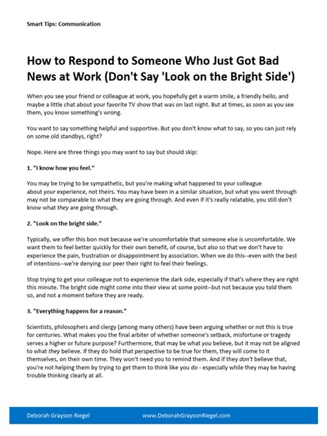 Responding to bad news isn’t one-size-fits-all, guys. The context and the relationship you have with the person involved significantly shape your approach. Let’s break down a few common scenarios to give you a better idea of how to tailor your response. Professional Setbacks : If a colleague or team member receives bad news, like a project being cancelled or a performance review that didn’t go well, your response should be supportive yet professional. Focus on acknowledging the difficulty of the situation, offering constructive feedback if appropriate and requested, and exploring ways to move forward. Avoid gossip or public criticism. Instead, offer private support and reassurance. For example, “I understand this isn’t the outcome we hoped for, and it’s okay to feel disappointed. Let’s focus on what we can learn from this and how we can approach the next steps effectively.” Personal Losses : When someone experiences a personal tragedy, like the loss of a loved one or a serious illness, your response needs to be profoundly empathetic and sensitive. The focus here is on offering comfort, presence, and non-judgmental listening. Practical help, like meals or errands, can be invaluable. Say less, listen more. A simple “I’m so sorry for your loss. I’m thinking of you,” can be more than enough. Relationship Issues : If you’re responding to bad news within a relationship, such as a breakup or a significant disagreement, your approach should be about clear, honest, and respectful communication. Acknowledge the other person’s feelings, express your own clearly without blame, and try to find a path forward, whether it’s reconciliation or respectful separation. Team or Group Setbacks : When bad news affects a whole team or organization, leadership plays a crucial role. The response needs to be transparent, honest, and provide clear direction. Leaders should acknowledge the challenges, explain the ‘why’ behind decisions, and rally the team towards a common goal. Tailoring your response ensures that your support is perceived as genuine and effective. Consider the person’s personality, your relationship with them, and the nature of the news itself. What one person finds comforting, another might find intrusive. Always prioritize respect, honesty, and compassion. The goal is to strengthen the connection, not to add to the distress. Understanding these nuances will make your responses much more impactful and appreciated.