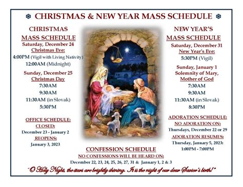 Beyond Holy Week and Easter, there are other important Holy Days of Obligation throughout the year. These days commemorate significant events in the lives of Jesus, Mary, and the saints, and attending Mass is considered a sacred duty for Catholics. Some common Holy Days of Obligation include Christmas (December 25th), the Solemnity of Mary, Mother of God (January 1st), the Ascension of Jesus, the Assumption of the Blessed Virgin Mary (August 15th), and All Saints’ Day (November 1st). The Immaculate Church mass times for these Holy Days will be announced in advance, typically on the church’s website, in the weekly bulletin, and through announcements during Mass. These services are often more formal and may include special readings and prayers relevant to the occasion. Check the schedule carefully to ensure you attend the correct Mass, as times may vary. It’s a great opportunity to deepen your understanding of your faith and share in the communal celebration. These Holy Days offer a chance to pause from your regular routines and reflect on the important moments in the life of the Church. Check the website and announcements for the specific Immaculate Church mass times during these special celebrations. Attending these services is a way to honor the saints, celebrate the significant moments in the life of Jesus and Mary, and to connect with your faith community. So, stay informed and plan to be there to participate in these important celebrations.