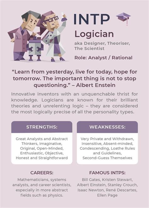 Furthermore, INTPs are often described as creative and inventive. They have a knack for seeing connections between seemingly unrelated ideas and for coming up with innovative solutions to problems. They thrive in environments where they can use their intellect to solve challenges. They excel in fields like science, technology, engineering, and mathematics (STEM), but can be found in many other areas where critical thinking and problem-solving are valued. They enjoy the process of brainstorming and experimenting.