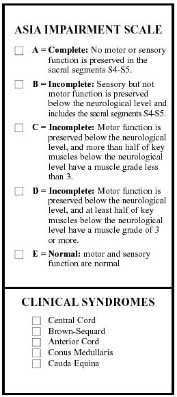 • ASIA Impairment Scale (AIS): This is a letter grade (A, B, C, D, or E) that describes the degree of impairment. We’ll get into this in more detail later, but it’s a quick way to classify the severity of the injury.