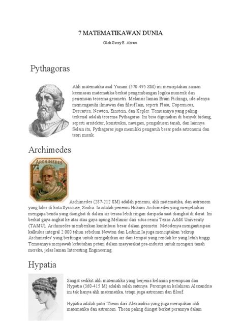 Ketika kita berbicara tentang matematikawan terhebat di dunia , nama Archimedes (sekitar 287–212 SM) pasti muncul di benak. Bayangkan saja, di era ketika kalkulator belum ada, bahkan konsep dasar geometri pun masih berkembang, Archimedes sudah mampu menghasilkan karya-karya yang luar biasa revolusioner . Beliau adalah seorang fisikawan, insinyur, penemu, astronom, dan yang terpenting, seorang matematikawan brilian dari Syracuse, Yunani Kuno. Salah satu kontribusi paling terkenalnya adalah pemahaman tentang luas dan volume benda-benda yang bentuknya tidak beraturan. Legenda mengatakan, saat ia menemukan prinsip daya apung (yang sekarang kita kenal sebagai Prinsip Archimedes) di bak mandi, ia langsung berlari telanjang di jalan sambil berteriak “Eureka!” (yang berarti “Aku menemukannya!”). Ini menunjukkan betapa besar penemuan itu baginya, dan bagaimana penemuan itu bisa mengubah pemahaman kita tentang fisika dan terapannya. Selain itu, Archimedes juga memberikan perkiraan yang sangat akurat untuk nilai pi (π), lebih baik dari siapapun pada masanya, dengan menggunakan metode calculus yang sangat canggih untuk zamannya. Dia menggunakan metode exhaustion untuk menghitung luas di bawah parabola dan memperkirakan nilai pi dengan mengapit lingkaran dengan poligon beraturan yang jumlah sisinya semakin banyak. Karyanya dalam geometri, seperti perhitungan luas permukaan dan volume bola, kerucut, dan silinder, masih menjadi dasar dari banyak bidang ilmu pengetahuan dan teknik saat ini. Dia bahkan mengembangkan metode untuk menghitung jumlah bilangan yang sangat besar, menunjukkan pemahaman mendalam tentang skala dan kuantitas. Kemampuannya untuk menghubungkan matematika murni dengan aplikasi praktis, seperti dalam perancangan mesin perang dan sistem irigasi, menjadikannya sosok yang benar-benar unik. Warisannya bukan hanya terbatas pada rumus-rumus, tetapi juga pada semangat penemuan dan keingintahuan yang tak terbatas. Archimedes membuktikan bahwa matematika adalah alat yang ampuh untuk memahami dan memanipulasi dunia di sekitar kita, menjadikannya salah satu matematikawan terhebat di dunia yang patut dikenang selamanya. Dia adalah bukti nyata bahwa kecerdasan dan inovasi bisa bersinar bahkan di era yang paling awal sekalipun.