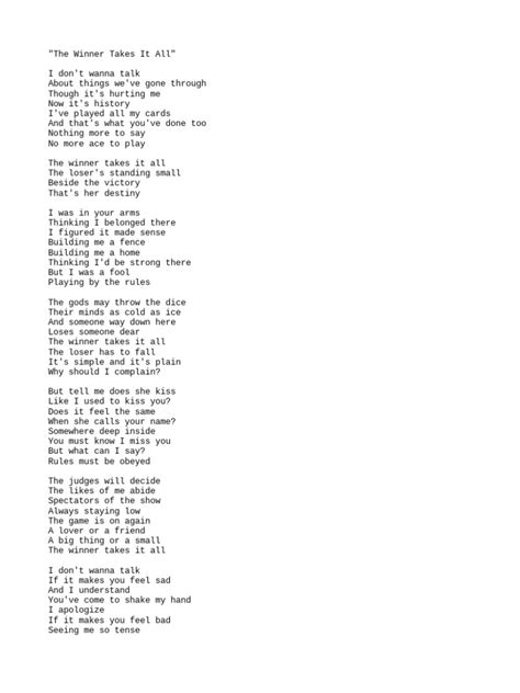 The ABBA song perfectly encapsulates this emotional divide. The lyrics speak directly to the pain of being the one left behind, the one who experiences the full emotional fallout of a failed relationship or competition. “You can choose a ready heart / That’s prepared to play the part / I could play the victim, but no, no, no / You can take the world and all that goes with it / I’m still here, but you’re not.” This highlights how “winner takes it all” can mean taking someone’s happiness, their future, or their peace of mind. The winner gets to move on, often unburdened, while the loser is left to grapple with the emotional debris. This stark contrast between the victor’s gain and the vanquished’s loss underscores the profound human element of competition, where the stakes are often deeply personal and the outcomes can shape one’s emotional landscape for a long time.