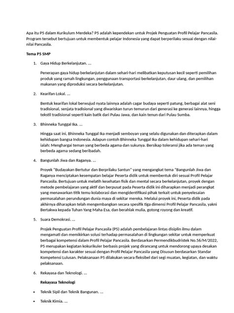 In conclusion, guys , P5 adalah inti dari Kurikulum Merdeka yang bertujuan untuk membentuk karakter siswa yang sesuai dengan nilai-nilai Pancasila. Melalui P5, siswa diajak untuk mengalami proses belajar yang lebih bermakna, relevan, dan kontekstual. Meskipun ada tantangan, implementasi P5 yang sukses membutuhkan perencanaan yang matang, kerjasama yang baik, dan dukungan dari berbagai pihak. So , mari kita dukung implementasi P5 agar pendidikan di Indonesia semakin berkualitas dan menghasilkan generasi yang unggul. Let’s make it happen! P5 bukan hanya sekadar proyek, tetapi juga katalisator perubahan dalam dunia pendidikan. Let’s embrace it! Dengan P5, kita bisa menciptakan generasi yang berkarakter, berpengetahuan, dan siap menghadapi tantangan di masa depan. The future is bright! Jadi, jangan ragu untuk berpartisipasi aktif dalam P5. It’s an amazing opportunity! Mari kita bersama-sama mewujudkan pendidikan yang lebih baik bagi masa depan Indonesia! Keep learning and growing!