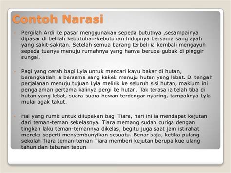 Coba deh bayangin kalau kamu lagi diceritain pengalaman liburanmu. Kamu nggak cuma bilang, “Aku kemarin liburan ke pantai.” Tapi pasti kamu bakal cerita, “*Kemarin itu guys, aku akhirnya kesampaian juga liburan ke Pantai Kuta! Pas nyampe sana, matahari lagi terik-teriknya , tapi angin lautnya sepoi-sepoi bikin adem. Aku langsung lari ke pantai, ombaknya lumayan gede , jadi seru buat main air. Pasir putihnya halus banget , ih, pokoknya betah deh di sana seharian!” Nah, kalimat-kalimat yang kamu tambahin itu, yang ngasih detail suasana, perasaan, dan urutan kejadian, itu semua adalah bagian dari narasi. Dia bikin cerita liburanmu jadi lebih kaya dan menarik buat didengerin.