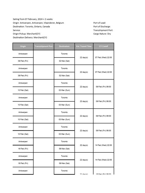 When you finally get your hands on the OOCL America sailing schedule , what exactly should you be looking for? It’s packed with vital details that can make or break your shipping plans. First up, you’ll see the Port of Loading (POL) and Port of Discharge (POD) . These are your starting and ending points, the bedrock of your shipment’s journey. Pay close attention to the exact names and codes of these ports, as variations can cause confusion. Next, you’ll find the Estimated Time of Departure (ETD) and Estimated Time of Arrival (ETA) . These are your key dates. Remember, they are estimated , so always factor in a buffer for unexpected delays. Understanding the difference between ETD and ETA is fundamental to managing expectations and planning subsequent logistics. The schedule also details the Vessel Name and Voyage Number . Knowing the specific vessel helps in tracking and can sometimes provide insights into the ship’s capacity or typical performance. The voyage number is like a unique identifier for that specific trip, crucial for record-keeping and communication. You’ll also see the Transit Time . This is the estimated duration of the sea journey between the POL and POD. It’s a critical factor in determining overall delivery timelines and is essential for supply chain planning. Some schedules might even break down the transit time by specific legs of the journey if the vessel makes multiple stops. Keep an eye out for information on Frequency , which tells you how often a particular service runs (e.g., weekly, bi-weekly). This helps in understanding the reliability and availability of the service for ongoing shipments. Finally, you might find details about Cut-off times for receiving cargo at the port and documentation deadlines . Missing these cut-offs can mean your cargo gets rolled over to the next available vessel, causing significant delays. Understanding all these components empowers you to make the most informed decisions about your shipments, ensuring everything runs like a well-oiled machine. It’s about deciphering the data to unlock maximum efficiency and predictability in your global trade operations. It’s the nitty-gritty that separates a smooth operation from a chaotic one.