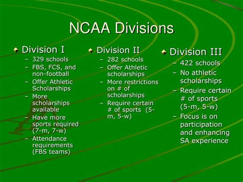The NCAA is divided into three divisions: Division I, Division II, and Division III. Division I schools are typically the largest and most competitive, offering athletic scholarships and often generating significant revenue through sports programs. Division II schools also offer athletic scholarships, but they tend to be smaller and less competitive than Division I schools. Division III schools do not offer athletic scholarships, emphasizing participation and academic achievement over athletic prowess.