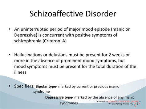 Key Disorders: The spectrum includes conditions like schizotypal personality disorder, schizoaffective disorder, schizophreniform disorder, and delusional disorder, in addition to schizophrenia. Schizotypal personality disorder is characterized by odd beliefs, eccentric behavior, and social anxiety. Schizoaffective disorder involves symptoms of both schizophrenia and a mood disorder, such as depression or mania. Schizophreniform disorder is similar to schizophrenia, but the symptoms last for a shorter duration (between one and six months). Delusional disorder is characterized by the presence of one or more delusions that last for at least one month, without other prominent psychotic symptoms.