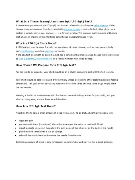 First off, let’s define what we’re talking about. Tissue transglutaminase (tTG) is an enzyme in your body that plays a crucial role in repairing tissues. Now, when someone has celiac disease, their immune system goes a little haywire when they eat gluten. Gluten, a protein found in wheat, barley, and rye, triggers an immune response that attacks the lining of the small intestine. This is where IgA comes in. IgA, or Immunoglobulin A, is an antibody that’s part of your immune system’s defense squad. In celiac disease, the body produces IgA antibodies that target tissue transglutaminase. So, the tissue transglutaminase IgA test looks for these specific antibodies in your blood.