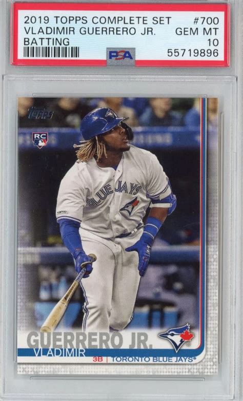 • 2019 Topps Series 1: Topps is a classic brand, and this set includes Vlad Jr.’s base rookie card. While the base card is less valuable than the chrome versions, a PSA 10 of this card is still a great find.