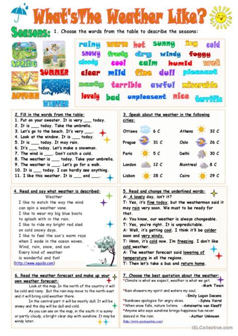 When you dive into weather liveworksheets B1 , you’ll discover a fantastic variety of exercises designed to tackle weather topics from all angles. These aren’t just simple fill-in-the-blanks; they’re crafted to test your comprehension, vocabulary recall, and even your ability to form sentences. One of the most common types is the matching exercise . You might have a list of weather conditions on one side (like ‘hail’, ‘drizzle’, ‘gale’) and their definitions or corresponding icons on the other. You’ll draw lines to connect them, which is a super visual way to learn new terms and reinforce their meanings. Another popular format is the gap-fill . Here, you’ll read sentences or short paragraphs about weather scenarios, and you’ll need to insert the correct weather word or phrase into the blank spaces. For example, “The sky was dark and ___, so we decided to stay inside.” The answer would be ‘cloudy’ or perhaps ‘stormy’, depending on the context provided. These exercises are brilliant for understanding how words are used in context. Listening comprehension is also a big feature. You’ll often find exercises where you listen to a weather forecast or a description of the weather and then answer questions about it. This could involve ticking boxes, writing short answers, or even filling in missing words from the forecast you just heard. This is absolutely vital for developing your listening skills, which are often a challenge for B1 learners. Ordering sentences to form a coherent paragraph about a weather event or a daily forecast is another common task. This helps you understand the logical flow of weather-related descriptions and improve your sentence structure. Some weather liveworksheets B1 also include labeling activities . You might be given a picture of a weather scene (e.g., a stormy sky, a sunny beach) and asked to label different elements, like ‘clouds’, ‘lightning’, ‘sun’, or ‘wind’. This reinforces visual recognition of weather phenomena. You can also expect multiple-choice questions where you select the best word or phrase to complete a sentence or answer a question about weather. Finally, many worksheets incorporate short answer questions that encourage you to use the vocabulary you’ve learned in your own words, perhaps describing the weather in your town or predicting tomorrow’s forecast. The sheer diversity means you’re constantly challenged in different ways, making your learning experience much richer and more effective. These interactive tasks ensure you’re not just memorizing words but truly understanding and using them.