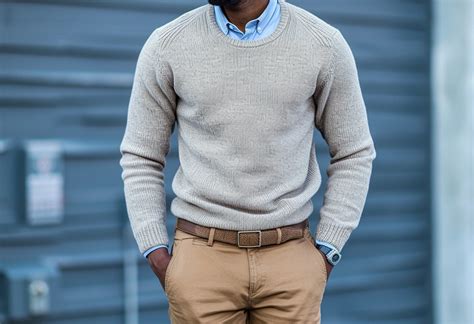 Let’s talk about accessories and colors that will make your yellow crewneck sweater for men pop. Accessories can make or break an outfit, and they’re especially important when working with a statement piece like a yellow sweater. First things first, consider a neutral color for your outerwear. Navy , black , grey , and olive green are all great choices for jackets and coats, as they won’t compete with the yellow. For example, a navy pea coat or a black leather jacket can be amazing options to go with your yellow sweater. Next, think about your shoes. Brown leather boots or loafers can create a classy look. White sneakers can create a more casual vibe. If you want to keep the focus on the sweater, keep the shoes simple and neutral.